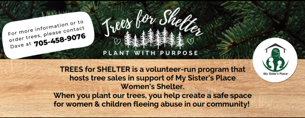 This program originated with past board members and blossomed into a well oiled agricultural fundraising machine. TREES FOR SHELTER cultivates and sells potted trees Under the expertise of Dave Johnson's farming abilities, the trees all blossomed into beautiful trees ready to be planted. Call 705-458-9076 for more information or to place your!