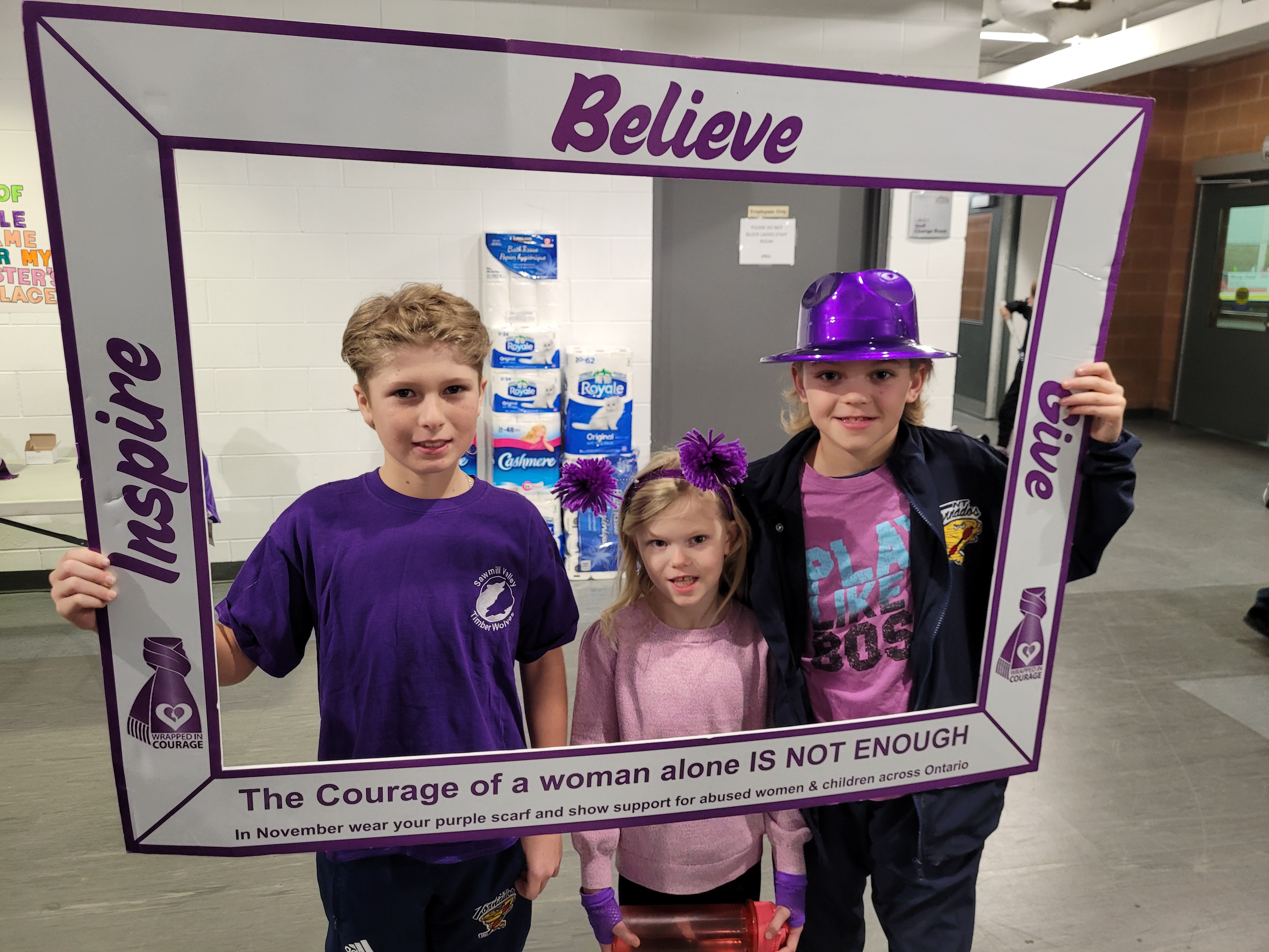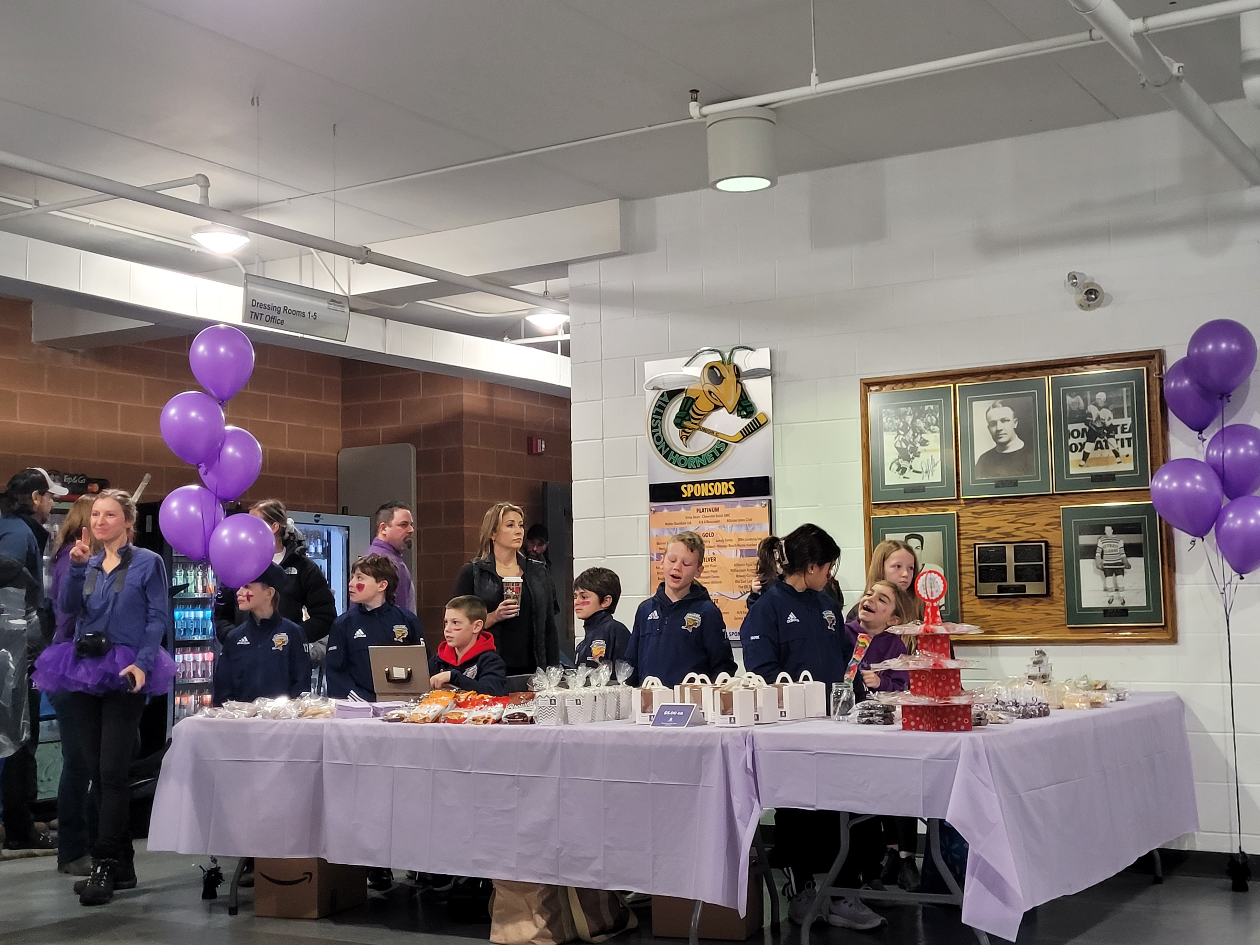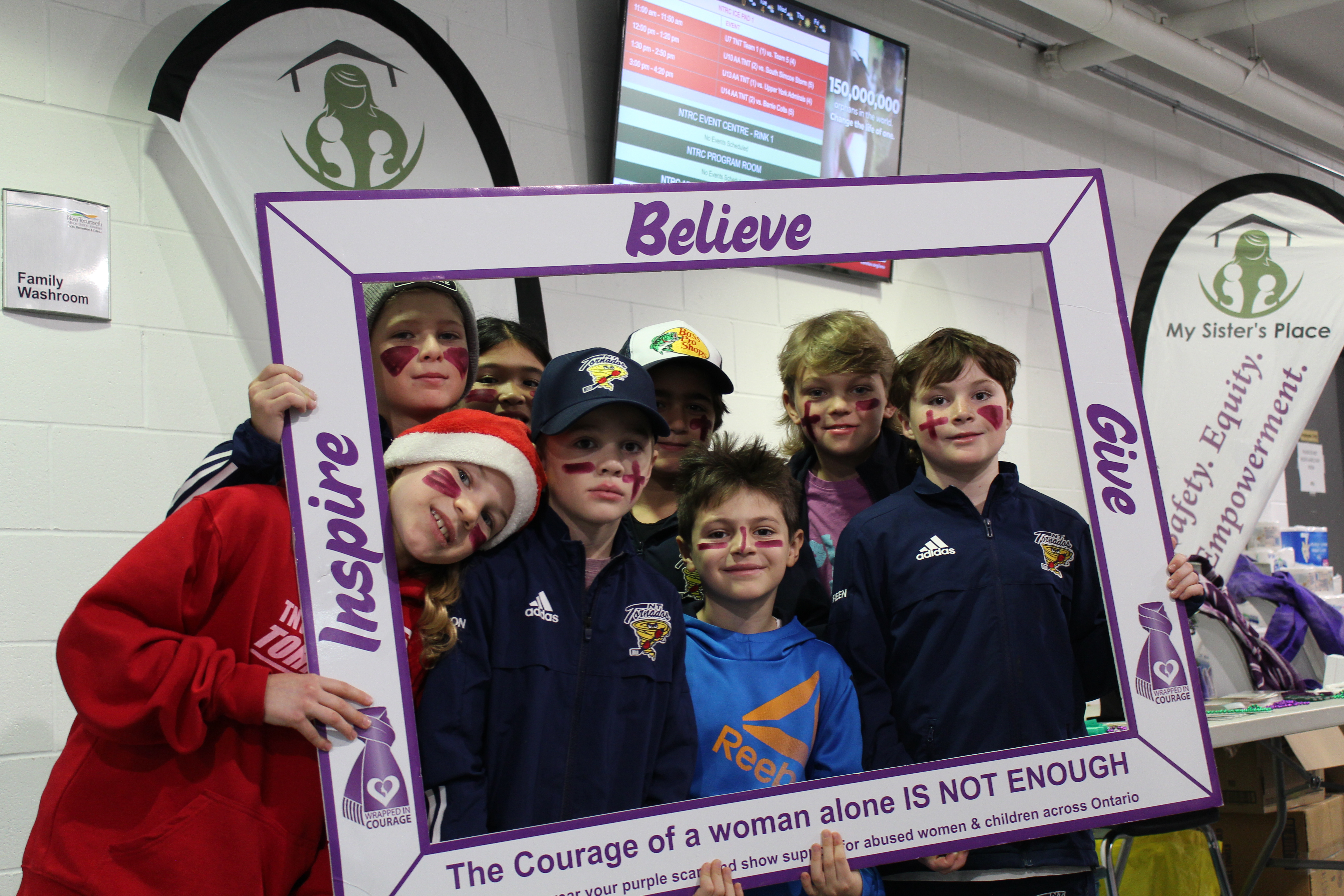 Saturday December 9th the U10 TNT hockey team hosted the Power of Purple hockey game, along with the visiting team the South Simcoe Storm, they collected a trailer load of items that were on our most needed wish list. The team, with the help of their families also ran a bake sale that raised $600. There was a face painting table and we were invited to be a part of the event selling our Wrapped in Courage items. Purple was everywhere, even down to the smallest details on the players sticks and helmets! A huge thank you to Derek French, the U10 TNT team and their families for organizing such am amazing day. We are so thankful and grateful for community supporters!
