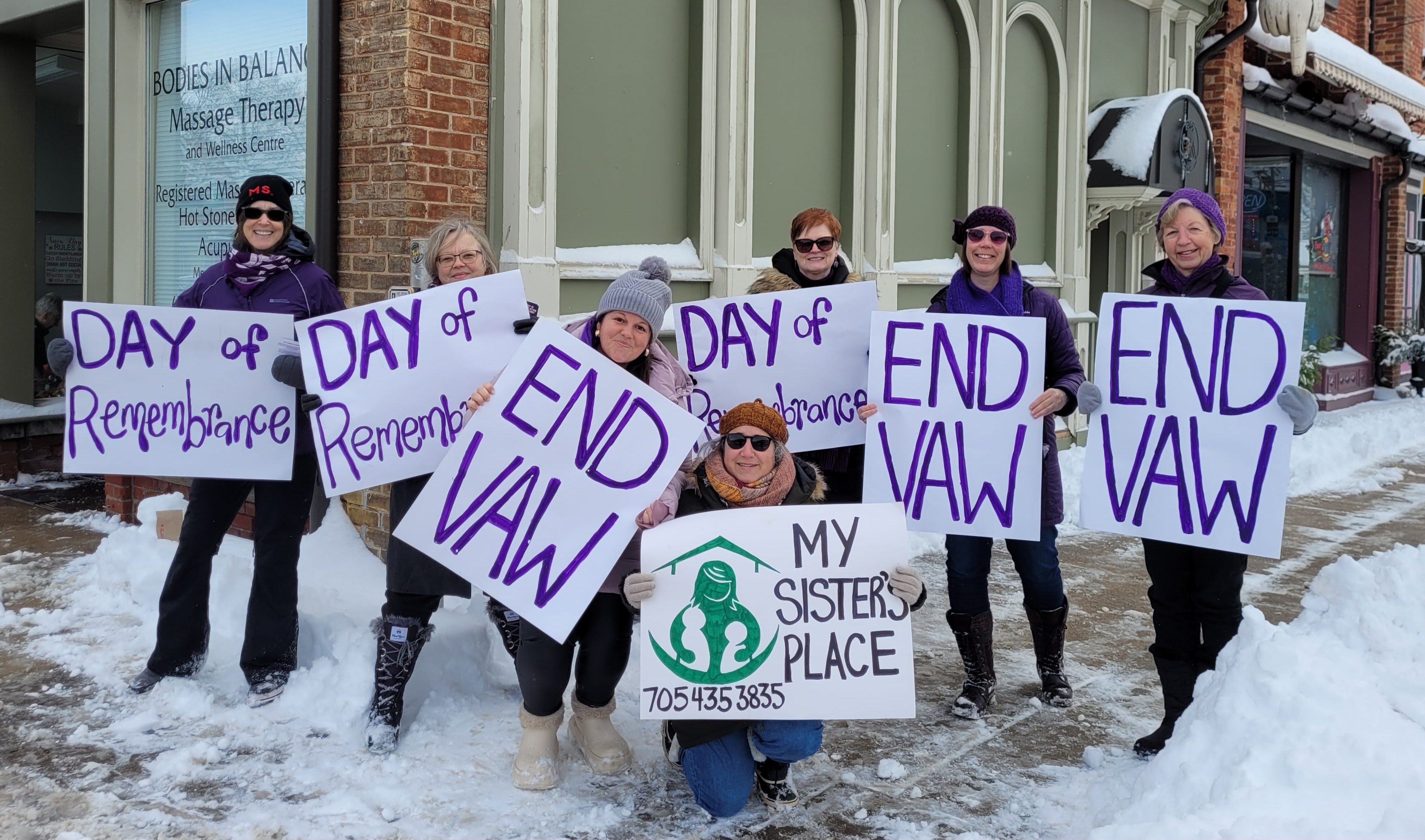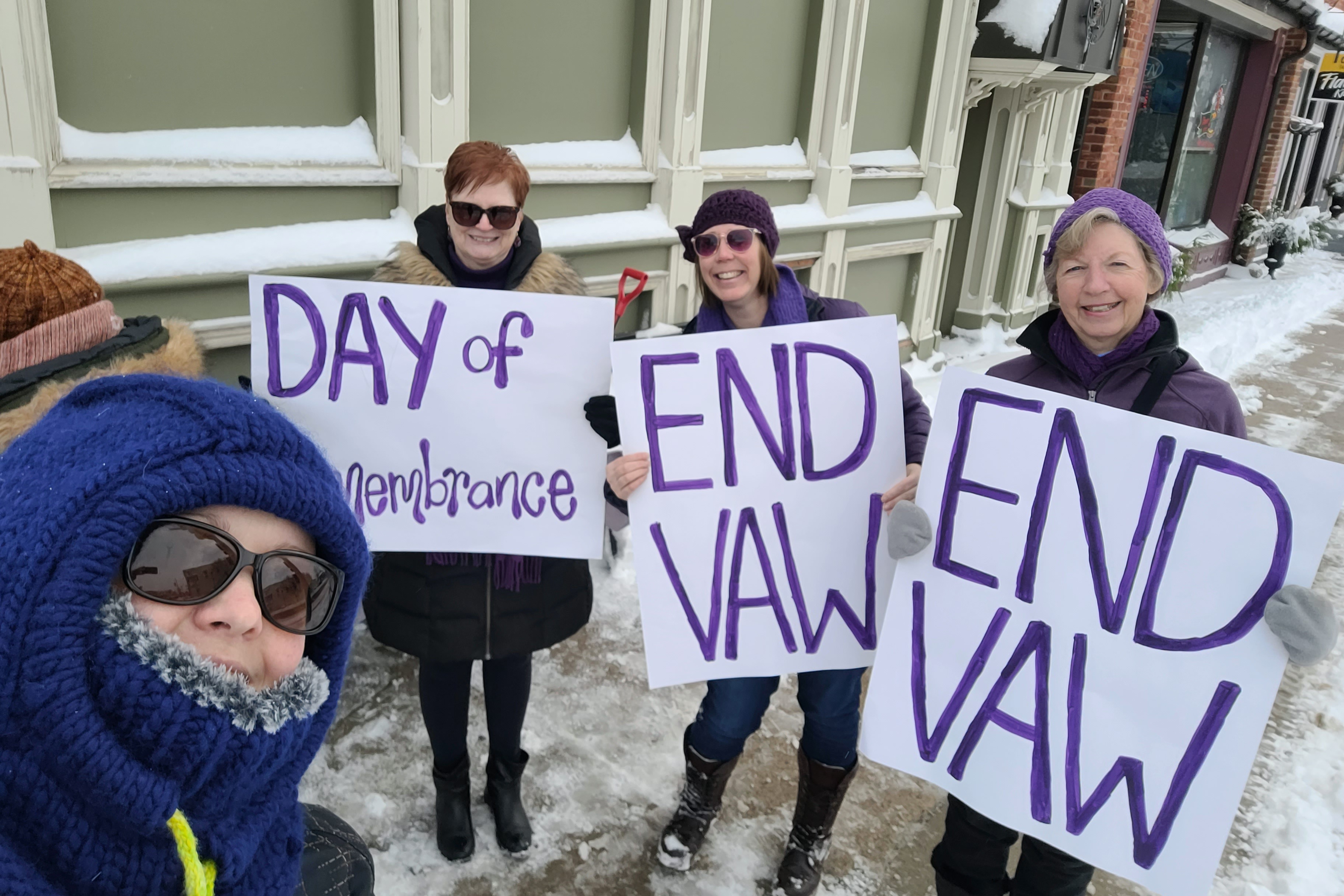 Friday December 6th was National Day of Remembrance and Action on Violence Against Women. It was a snowy morning but we gathered at the corner of Victoria Street and Church Street in Alliston to bring awareness and to remember those women killed in the Montreal Massacre in 1989 and all those who loose their lives to femicide each year. Thank you to those who joined us, the those who stopped and asked questions and for those who honked while passing by.