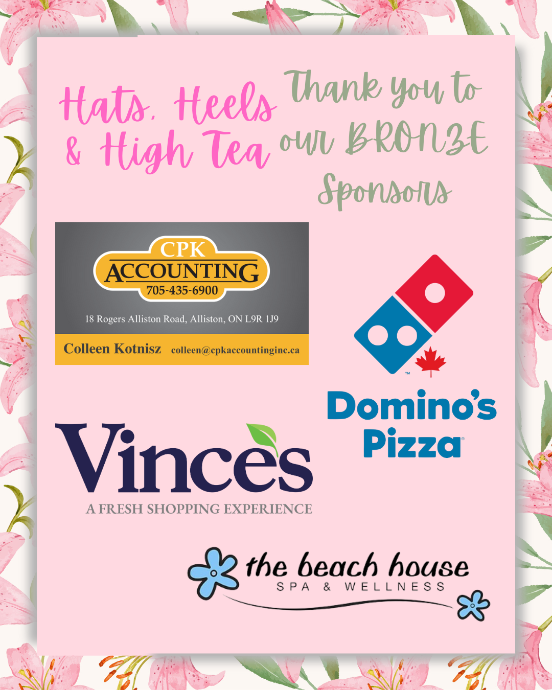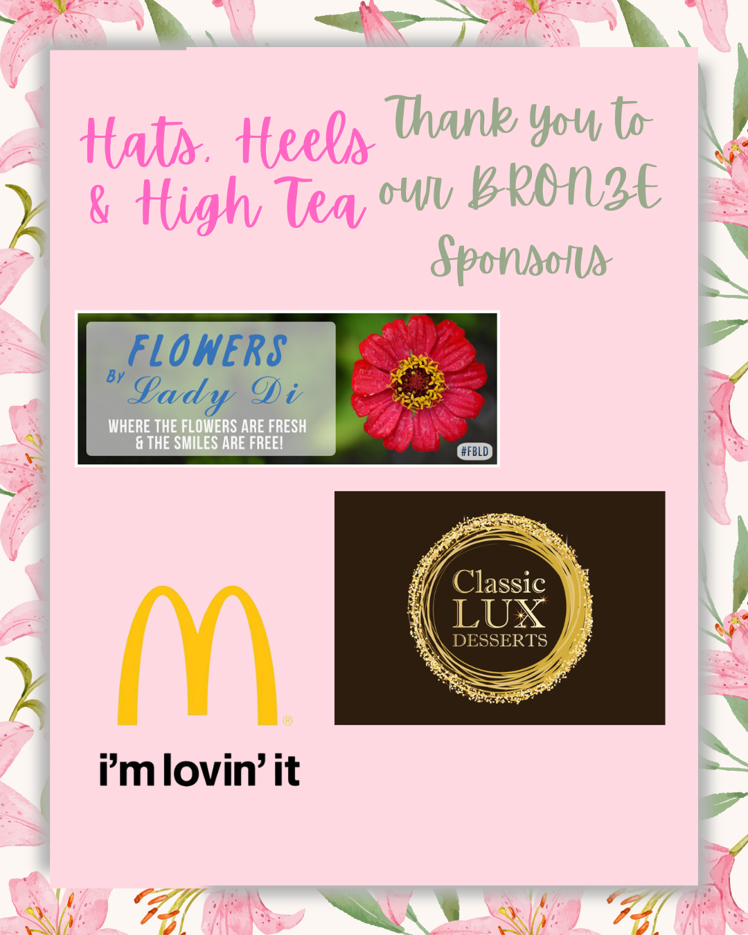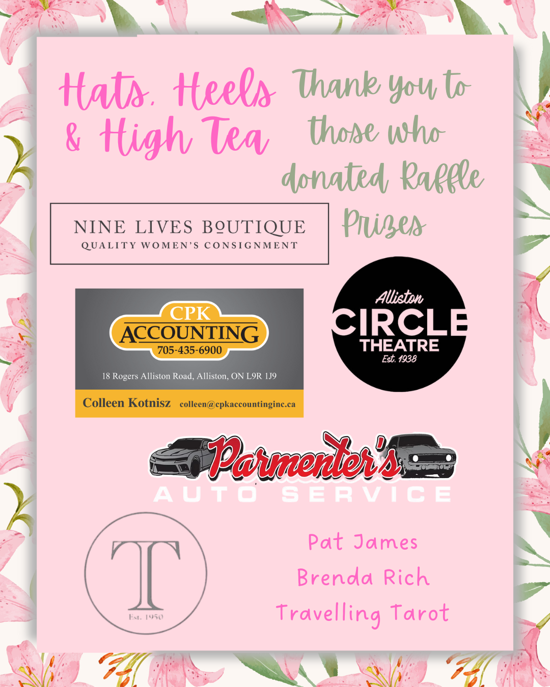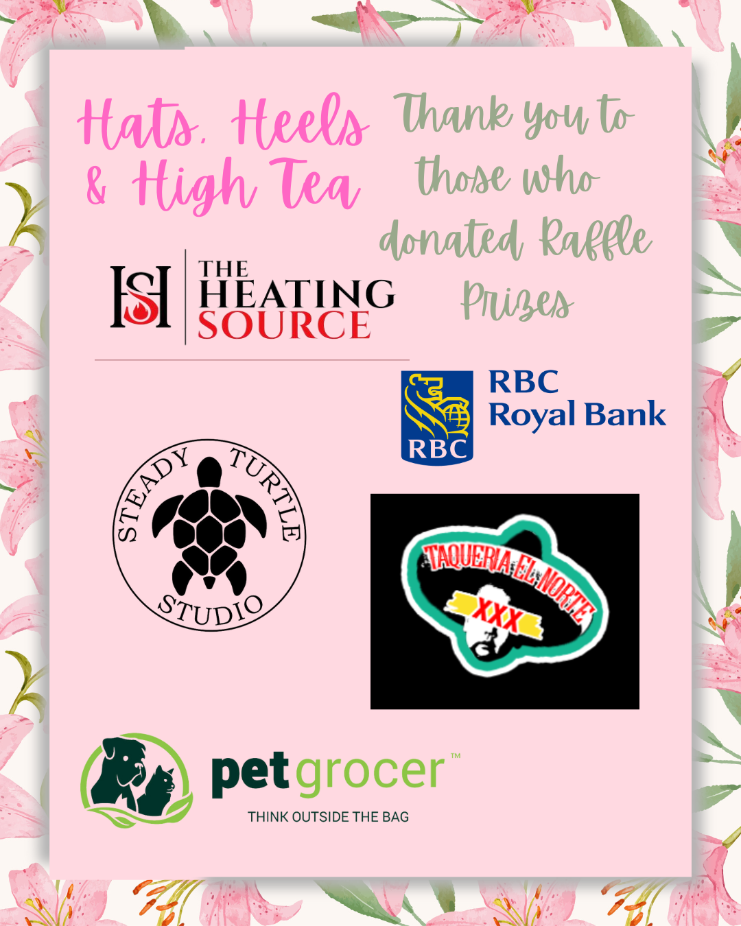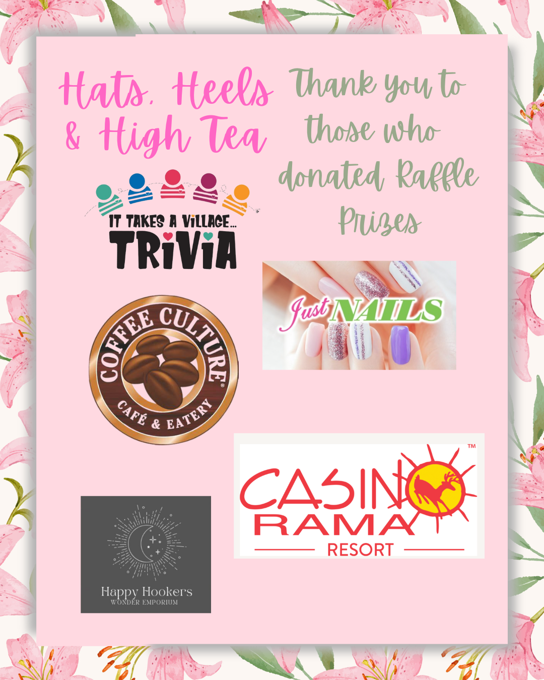 On March the 8th we held our annual Hats, Heels and High Tea fundraiser. We would like to give a heart felt thank you to all those who bought tickets and attended, who bought raffle tickets and made cash donations. Thank you to our generous sponsors, your support enables us to cover the costs of the tea and allows us to raise more money at the event. Thank you to those who donated raffle prizes, the raffle is a big part of the funds raised and the amazing prizes we are donated make this raffle the success it is. Thank you to those who donated to the swag bags, these bags are an extra treat that our guests enjoy every year. Lastly but certainly not least, thank you so much to our hard working volunteers, with out you events like this do not happen.